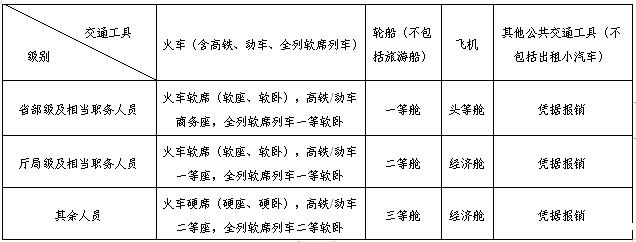 第七条 出差人员应当按规定等级乘坐公共交通工具。乘坐公共交通工具的等级见下表: