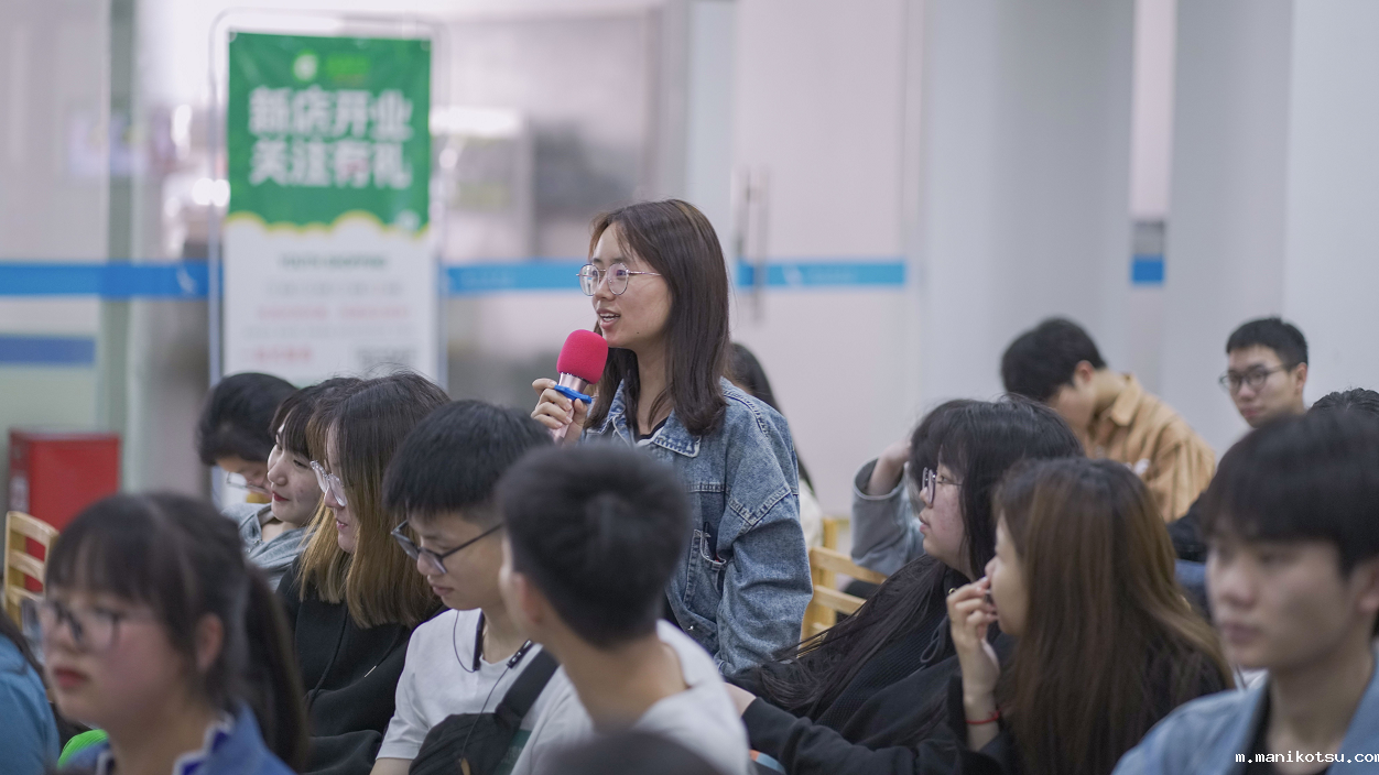 图1 胡卉老师与叁道寿司项目负责人介绍创业过程并答学生问