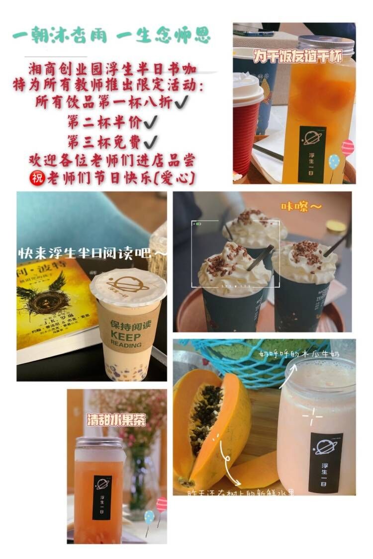 位于湘商创业园四楼的浮生半日书咖也为迎接教师节的到来做了充分准备,并特别策划了教师节优惠活动。作为学校的网红打卡地,书咖给老师们提供一个温馨舒适的小憩场所;书咖的饮品和服务态度也得到了老师们的一致好评。