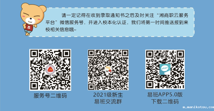 1.关注学院易班微信号。微信扫描下方二维码关注“湘商职云服务平台”服务号,并按《2021级新生入驻易班邀请函》(见附件1)做好认证工作,并在校本化应用中填报个人相关信息。我们也将通过系统第一时间下发有关来校报到的疫情防控相关要求,也请你在系统中配合学院各项来校报到前的有关工作。