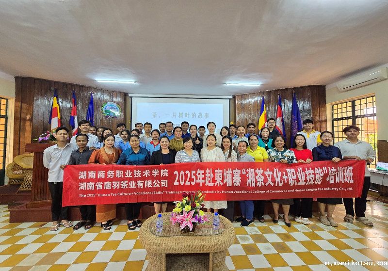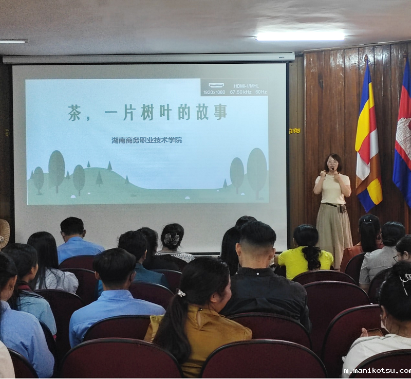 2025年,韦德com积极响应国家“一带一路”倡议,携手湖南省唐羽茶业有限公司来到柬埔寨波雷列国立农业大学,开展了一场别开生面的“湘茶文化+技能”培训暨“五彩湘茶”文化交流活动。35名师生共同聆听《茶,一片树叶的故事》,感受茶文化的深厚魅力。师生们对中国茶表现出浓厚的兴趣,在互动环节提出各种关于中国茶的问题,授课教师对学员们的问题一一耐心解答。