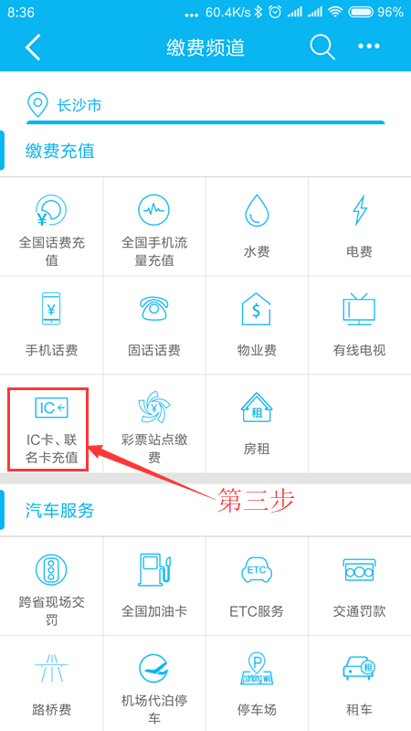 第三步,在“缴费频道”中点击“IC卡、联名卡充值”