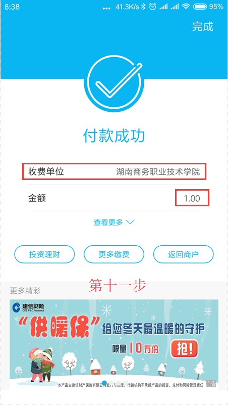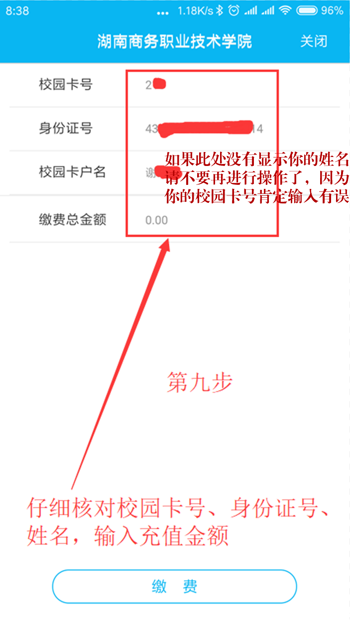 第九步,核对校园卡号,持卡人的身份证号、姓名,输入充值金额(建行APP显示为“缴费总金额”,也就是充值金额),然后点击“缴费”