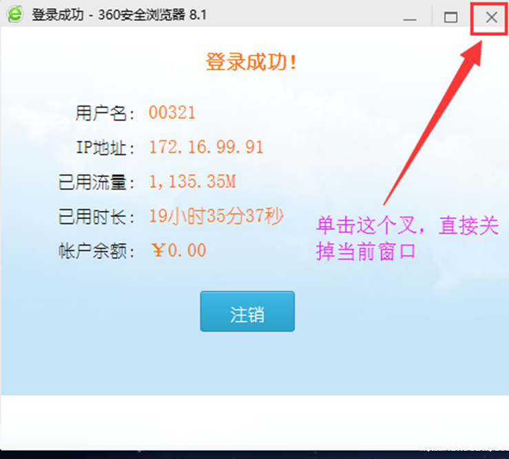 第三步:执行完第二步后,参照“图三”,关闭弹出的窗口后即可正常上网了。