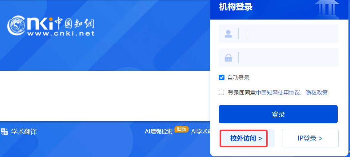 1.登录中国知网数据库(https://www.cnki.net/),点击机构登录,在弹窗内选择“校外访问”。(推荐使用谷歌、火狐、360极速等对HTML5新特性兼容好的浏览器)