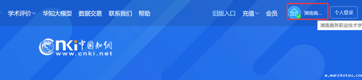 4.跳转至“中国知网”页面,右上角会显示机构“韦德com”,登录成功即可访问图书馆订购的CNKI中国知网学术资源。