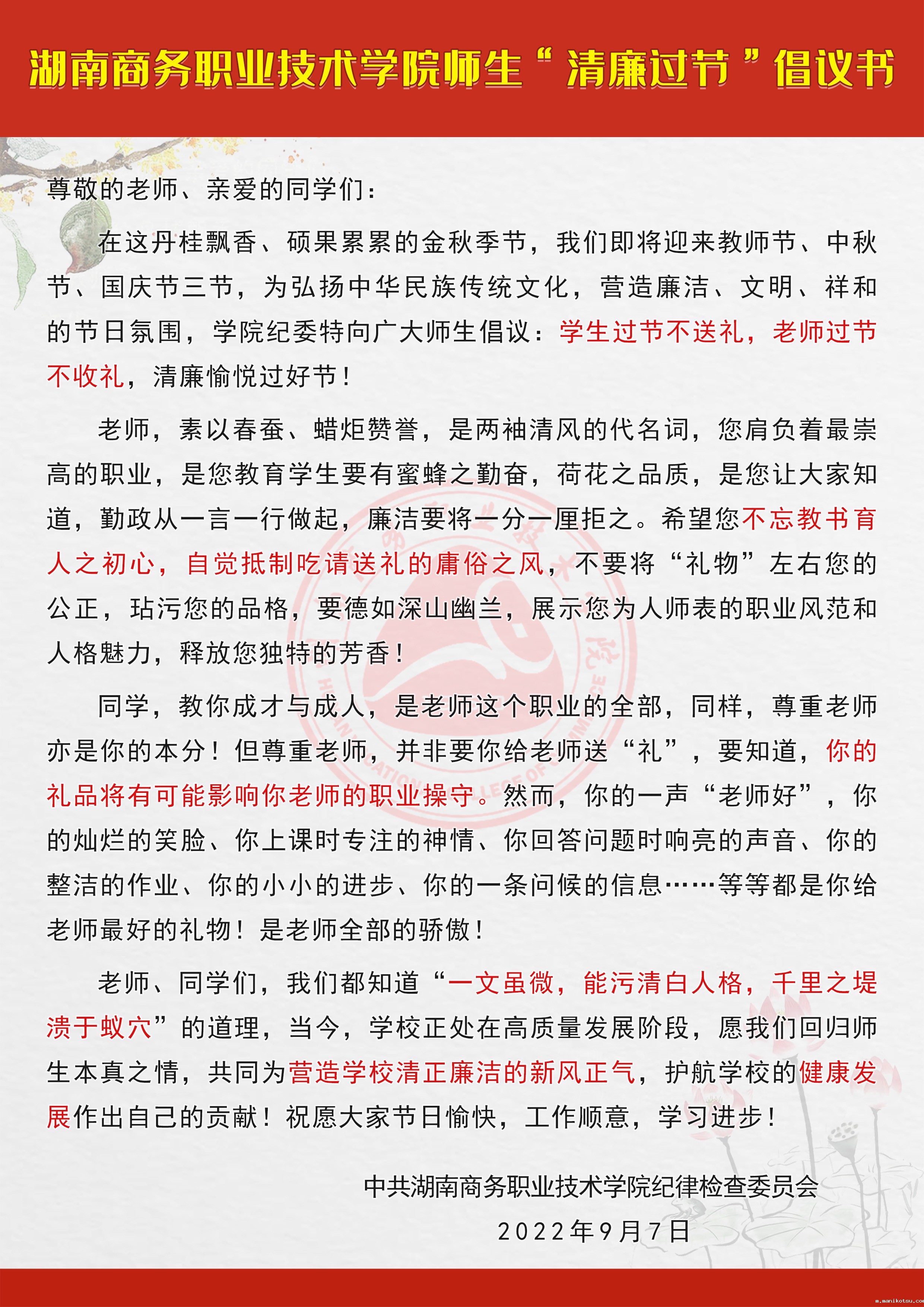 韦德com师生“清廉过节”倡议书