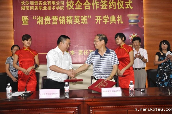 签约仪式前,宣传片《湘贵之势》全面地介绍了长沙湘贵实业有限公司历经九年的发展历程、发展理念、品牌定位、人才发展战略等。湘贵公司与我院有着长期友好的合作关系,为开创双方合作的新模式,长沙湘贵实业有限公司与我院合作开办“湘贵营销精英班”,实施“订单式”人才培养计划。这是我院经贸类专业应用型人才培养途径在校企合作上的进一步深化。